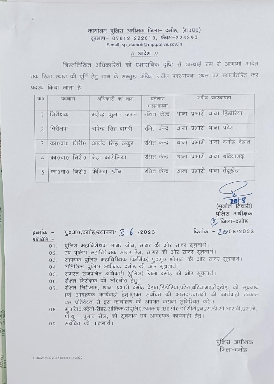 Transfer of station in-charge in Damoh: अब दमोह एसपी सुनील तिवारी ने जिले के कई थानों में पुलिसकर्मियों के तबादले किए है।