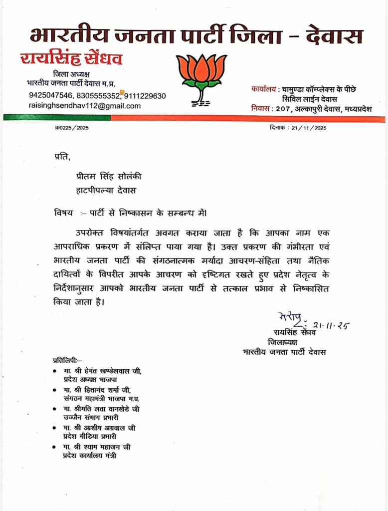 देवास भाजपा जिला इकाई के प्रमुख राय सिंह सेंधव के हस्ताक्षर से जारी किये गये निलंबन आदेश में लिखा है कि, “आपका नाम एक आपराधिक प्रकरण में संलिप्त पाया गया है। उक्त प्रकरण की गंभीरता एवं भारतीय जनता पार्टी की संगठनात्मक मर्यादा आचरण संहिता तथा नैतिक दायित्वों के विपरीत आपके आचरण को दृष्टिगत रखते हुए प्रदेश नेतृत्व के निर्देशानुसार आपको भारतीय जनता पार्टी से तत्काल प्रभाव से निष्कासित किया जाता है।”