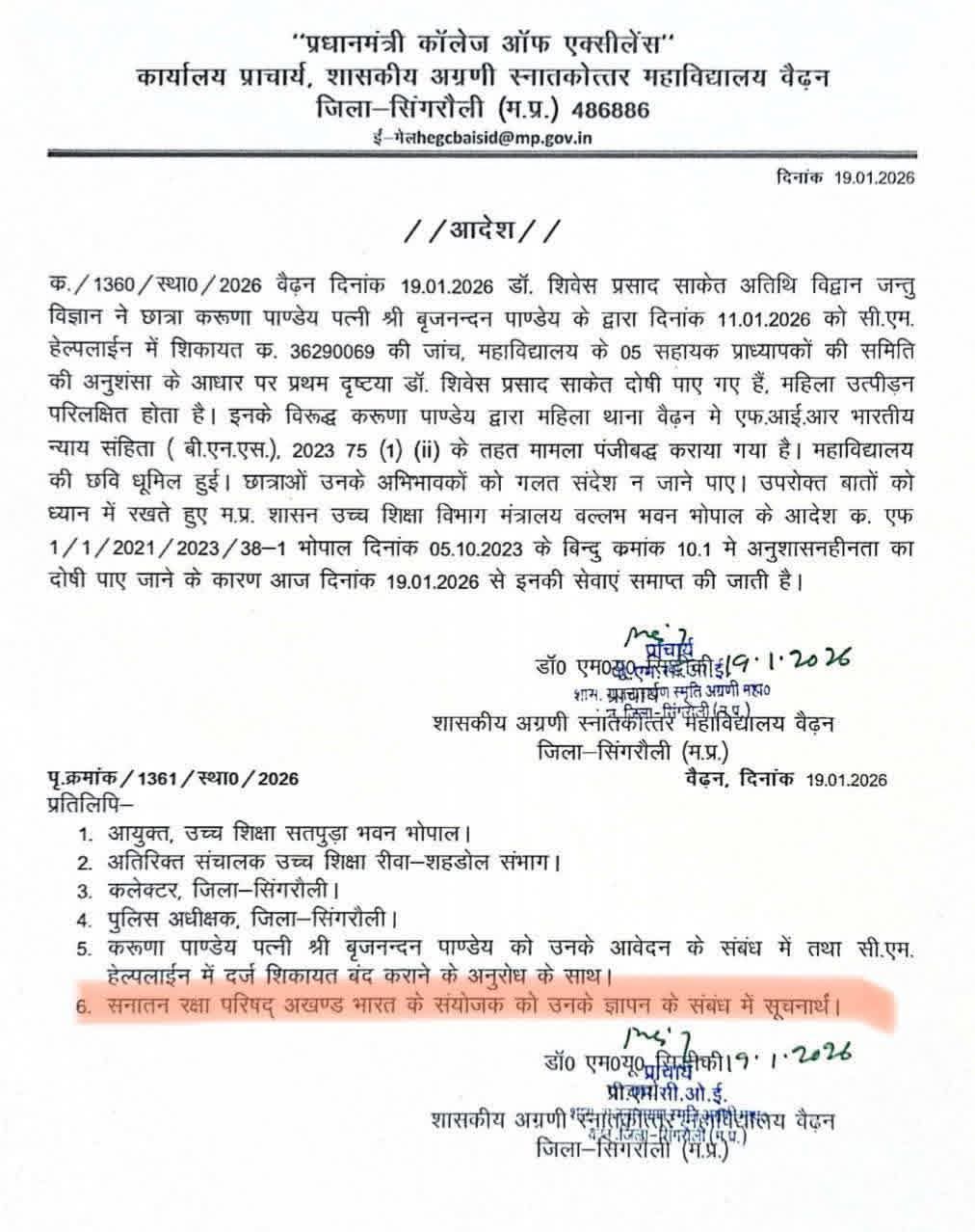सिंगरौली: Professor-Student Dirty Talk: सिंगरौली जिले के डिग्री कॉलेज, बैढ़न में पदस्थ अतिथि विद्वान शिवेश साकेत की सेवाएं समाप्त कर दी गई हैं। उन पर एक छात्रा से अश्लील बातचीत करने का गंभीर आरोप है। छात्रा की शिकायत पर महिला थाना बैढ़न में मामला दर्ज होने के बाद उच्च शिक्षा विभाग और जिला प्रशासन ने त्वरित कार्रवाई की।