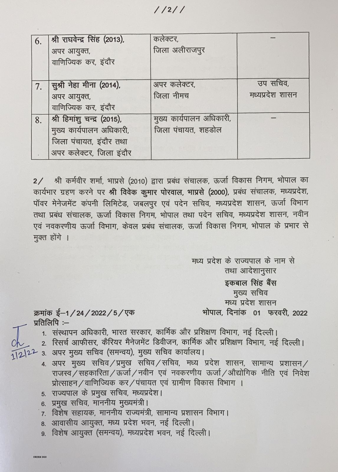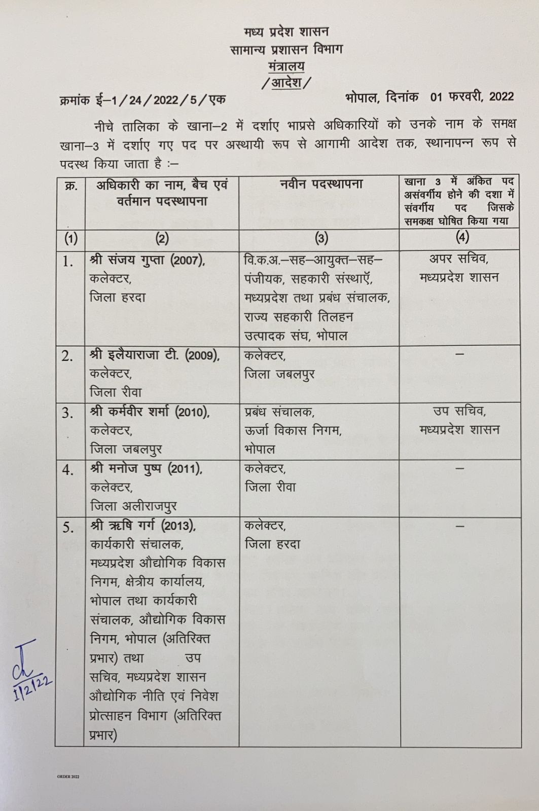 भोपाल: Transfer orders of IAS Officers मध्यप्रदेश सरकार ने मंगलवार को भारतीय प्रशासनिक सेवा के अधिकारियों का तबादला आदेश जारी किया है। जारी सूची में 8 आईएएस अफसरों सहित प्रदेश के 4 जिला कलेक्टर्स का भी नाम शामिल है। यह आदेश मंत्रालय वल्लभ भवन के सामान्य प्रशासन विभाग से जारी किया गया है।