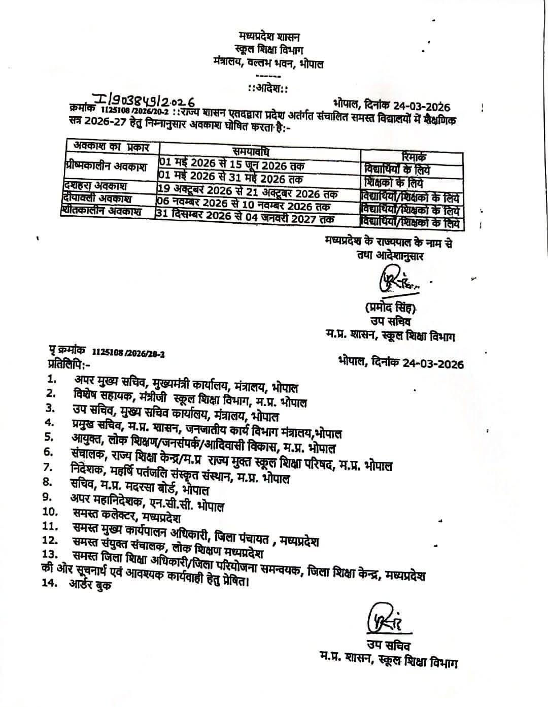 भोपालः School Holiday Latest News: मध्यप्रदेश स्कूल शिक्षा विभाग ने शैक्षणिक सत्र 2026-27 के लिए स्कूलों का अवकाश कैलेंडर जारी कर दिया है। ग्रीष्मकालीन अवकाश 1 मई से 15 जून तक रहेगा। वहीं, अक्टूबर माह में त्योहारों को ध्यान में रखते हुए 19 अक्टूबर से 21 अक्टूबर तक अवकाश घोषित किया गया है। दीपावली के अवसर पर 6 नवंबर से 10 नवंबर तक स्कूलों में छुट्टी रहेगी। इसके अलावा वर्ष के अंत में शीतकालीन अवकाश 31 दिसंबर से 4 जनवरी 2027 तक निर्धारित किया गया है। भोपाल में स्कूल शिक्षा विभाग ने शैक्षणिक सत्र 2026-27 के लिए स्कूलों का अवकाश कैलेंडर जारी कर दिया है। प्रदेशभर के सरकारी और निजी स्कूलों में तय अवधि के अनुसार छुट्टियां रहेंगी।