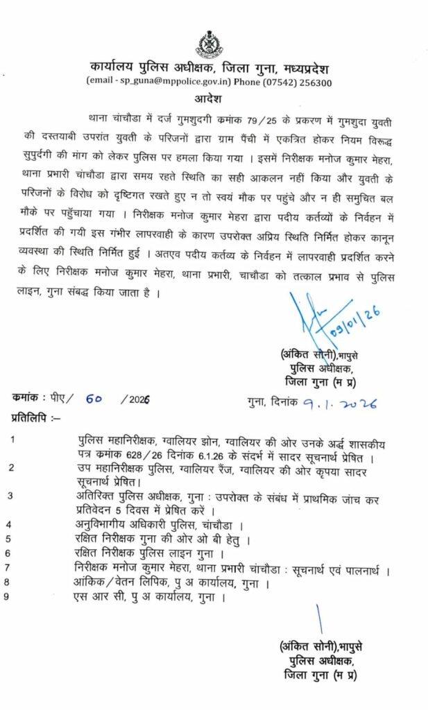 Thana Incharge Line Attached News: गुना SP अंकित सोनी ने तत्काल प्रभाव से चाचौड़ा थाना प्रभारी मनोज कुमार मेहरा को थाना प्रभारी पद से हटाकर लाइन अटैच कर दिया गया है।