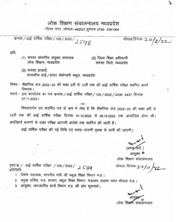 Half yearly exam from class 9th to 12th canceled : मध्यप्रदेश में 9वीं से 12वीं तक की होने वाली अर्द्ध वार्षिक परीक्षा पर सूचना जारी।
