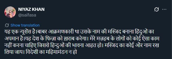 Babri Masjid uproar in Bengal आईएएस नियाज खान ने इस मुद्दे को लेकर अपने सोशल मीडिया पर एक पोस्ट किया है। जिसमें उन्होंने कहा कि ऐसा काम नहीं करना चाहिए जिससे हिंदुओं की भावना को आहत हों। उन्होंने अपने पोस्ट पर लिखा है कि ‘यह एक न्यूसेंस है। बाबर आक्रमणकारी था उसके नाम की मस्जिद बनाना हिंदुओं का अपमान है।यह देश के फिज़ा को ख़राब करेगा। मेरे मज़हब के लोगों को कोई ऐसा काम नहीं करना चाहिए जिससे हिन्दुओं की भावना आहत हो। मस्जिद का कोई और नाम रख लिया जाय। विदेशी का महिमामंडन न हो।’