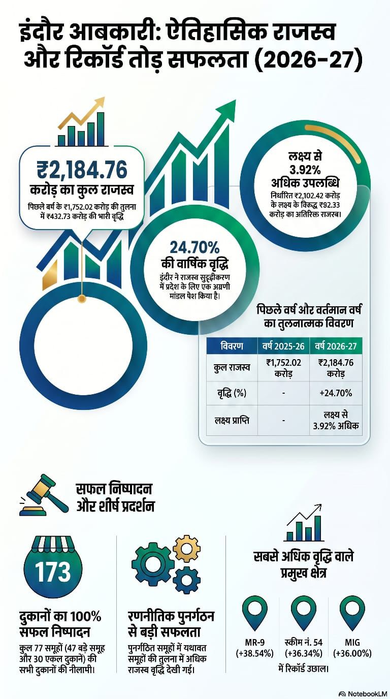 इंदौर में मदिरा दुकानों की ई-टेंडर प्रक्रिया से ₹2184.76 करोड़ का रिकॉर्ड राजस्व प्राप्त हुआ, जो निर्धारित लक्ष्य से भी अधिक है।