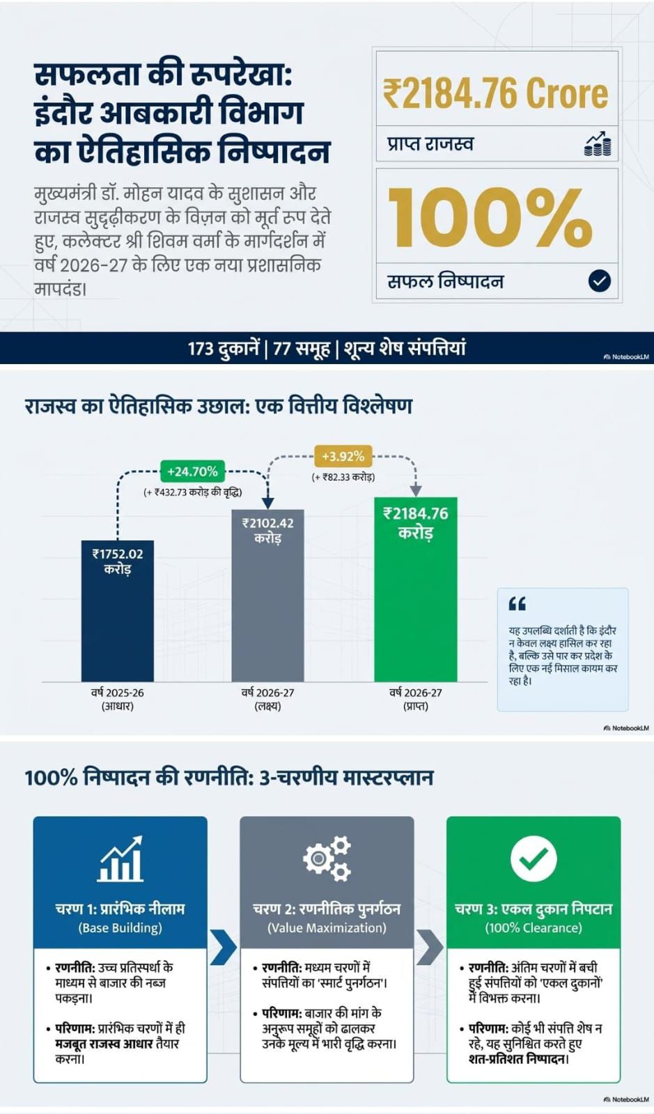 इंदौर ने इस बार पूरे मध्य प्रदेश में सबसे बेहतरीन प्रदर्शन किया है। जहाँ राज्य के अन्य जिलों में अभी भी कई दुकानों के ठेके होना बाकी हैं और करोड़ों का राजस्व अटका हुआ है, वहीं इंदौर ने अपनी सभी दुकानों की नीलामी समय पर पूरी कर ली है। फ़िलहाल इंदौर राजस्व के मामले में प्रदेश का नंबर-1 जिला बना हुआ है।