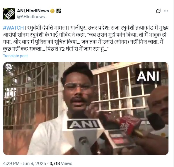 सोनम रघुवंशी के भाई गोविंद ने कहा कि, “जब उसने मुझे फोन किया, तो मैं भावुक हो गया और बाद में पुलिस को सूचित किया। जब तक मैं उससे (सोनम) नहीं मिल लेता, मैं कुछ नहीं कह सकता। पिछले 72 घंटों से मैं जाग रहा हूं। ” वहीं बता दें कि, राजा रघुवंशी की हत्या के बाद सोनम के घर पर पुलिस की तैनाती बढ़ाई गई है। इसके साथ ही सोनम के परिजन घटना का खुलासा होने के बाद से घर का दरवाजा बंद कर रखे हैं। घर पर किसी प्रकार की अप्रिय घटना ना हो इसके लिए बल तैनात किए गए हैं।