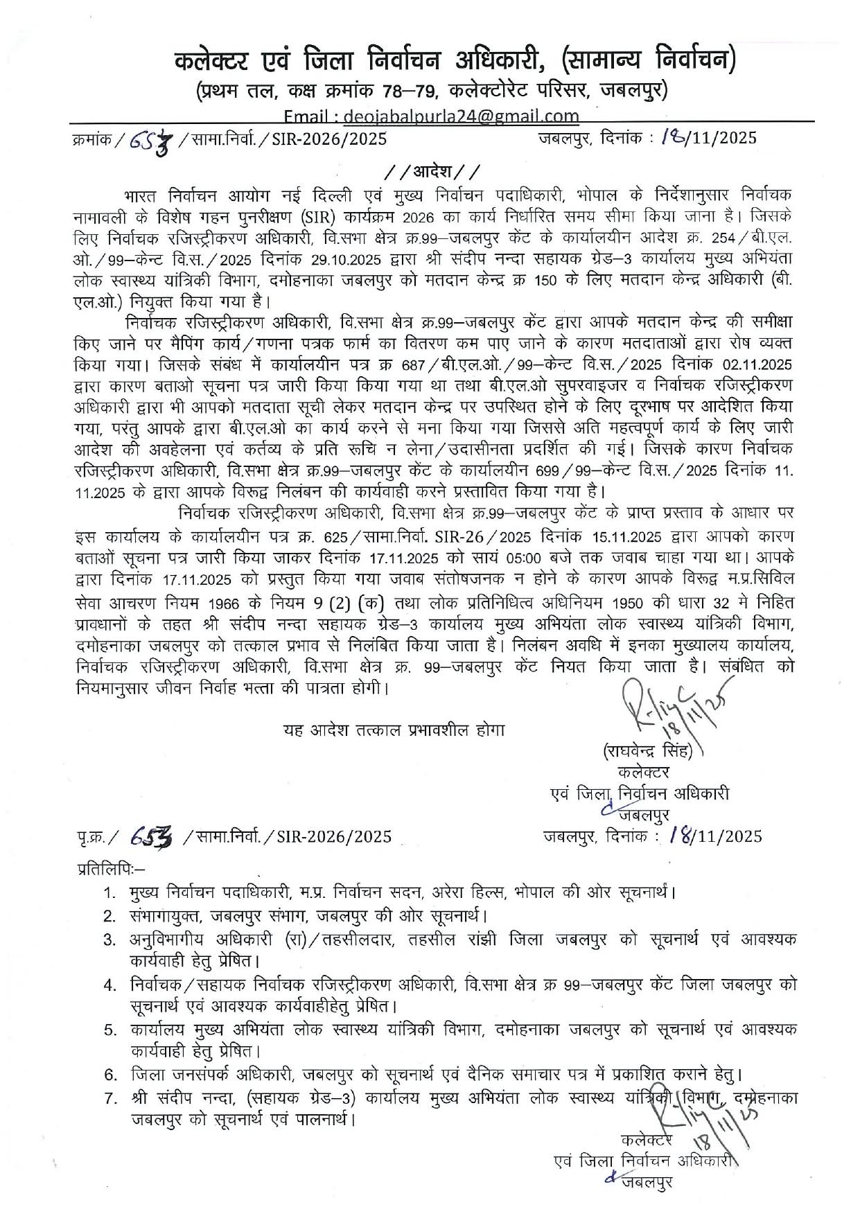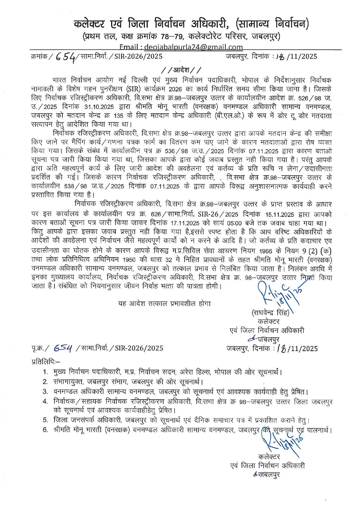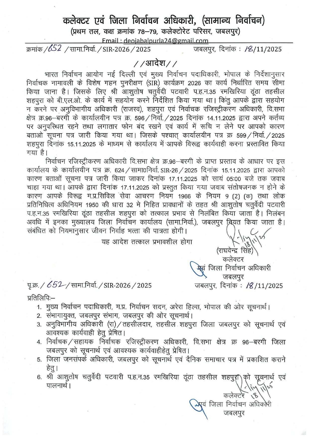 जबलपुर : Govt Employees Suspended News: जबलपुर में SIR कार्य में लापरवाही बरतने पर जबलपुर कलेक्टर राघवेंद्र सिंह ने दो बीएलओ और एक पटवारी को निलंबित कर दिया है। वहीं, गणना पत्रक के डिजिटाइजेशन में लगे हुए 9 कर्मचारियों के कार्य की चाल धीमी होने के कारण नोटिस जारी किया गया है।