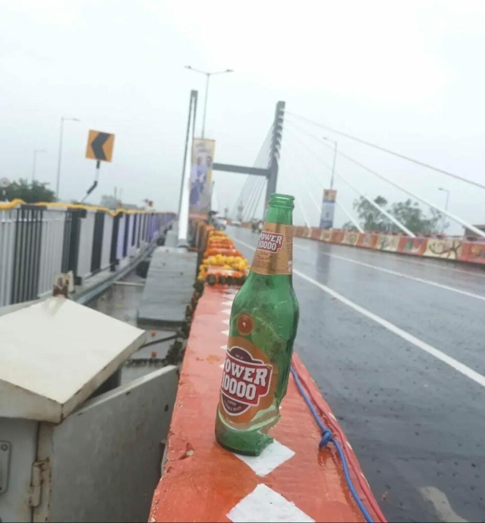 छटवीं तस्वीर फ्लाईओवर पर शराबखारी की है। फ्लाईओवर पर शराब की खाली बोतलें और पान की पीक दिख रही है जिसमें इस खूबसूरती को दाग लगाया जा रहा है।