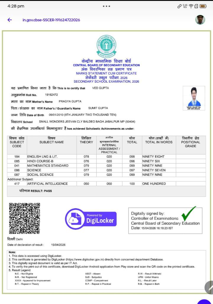 वेद गुप्ता के पिता सुमित कुमार गुप्ता और माता प्रज्ञा गुप्ता अपने बेटे की इस सफलता पर बेहद गर्व महसूस कर रहे हैं। CBSE Class 10th Topper MP वेद ने तकनीकी विषयों में अपनी विशेष रुचि दिखाते हुए आर्टिफिशियल इंटेलिजेंस (AI) में 100 में से 100 अंक प्राप्त किए हैं, जो उनकी मेधा को दर्शाता है।