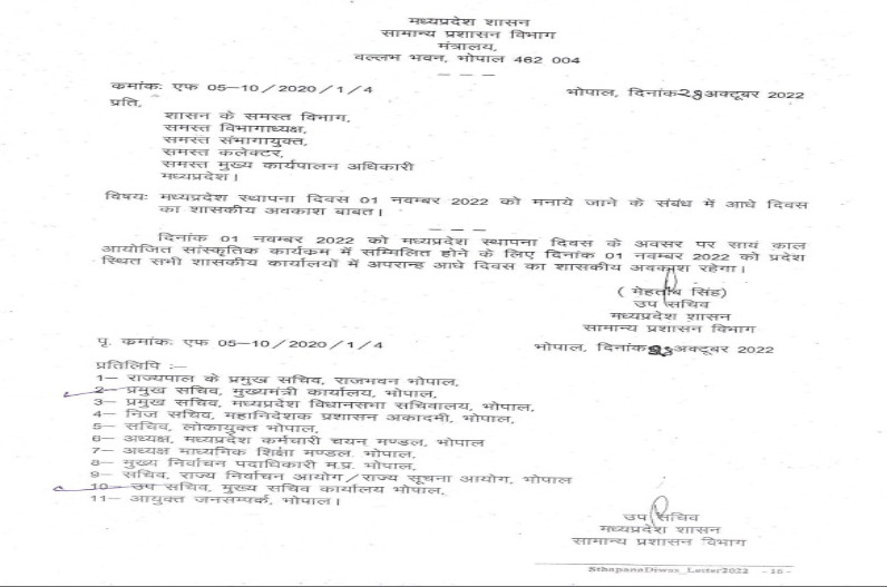 Madhya Pradesh Foundation Day 2022 : 1 नवंबर को प्रदेश में आधे दिन का अवकाश घोषित, प्रशासन ने जारी किया आदेश
