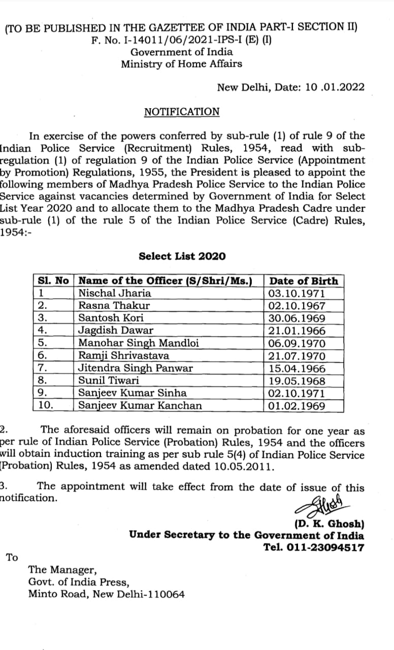 मध्यप्रदेश को मिले 10 IPS अफसर, राज्य प्रशासनिक सेवा के अधिकारियों की हुई DPC, केंद्रीय गृह विभाग ने जारी किया आदेश