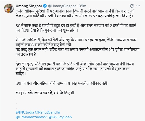 सुप्रीम कोर्ट के फैसले पर मध्यप्रदेश के नेता प्रतिपक्ष उमंग सिंघार ने कहा कि कर्नल सोफिया कुरैशी जी पर आपत्तिजनक टिप्पणी करने वाले भाजपा मंत्री विजय शाह को लेकर सुप्रीम कोर्ट की सख़्ती ने भाजपा की सोच और चरित्र पर बड़ा प्रश्नचिह्न लगा दिया है। SC ने साफ़ कहा है माफी में बहुत देर हो चुकी है और राज्य सरकार को 2 हफ्ते में यह बताने का निर्देश दिया है कि मुकदमा कब शुरू होगा। सेना की अधिकारी, देश की बेटी और राष्ट्र के सम्मान पर हमला हुआ, लेकिन भाजपा सरकार महीनों तक SIT की रिपोर्ट दबाए बैठी रही। यह कोई एक बयान नहीं, बल्कि सत्ता संरक्षण में पनपती असंवेदनशील और घृणित मानसिकता का उदाहरण है। देश की सुरक्षा में तैनात हमारी बहन के प्रति ऐसी ओछी सोच रखने वाले भाजपा मंत्री विजय शाह से मुख्यमंत्री को तत्काल इस्तीफा सहित उन्हें पार्टी के सभी दायित्वों से मुक्त करना चाहिए। देश की सेना और महिलाओं के सम्मान से कोई समझौता स्वीकार नहीं। कानून सबके लिए बराबर है, मंत्री के लिए भी।
