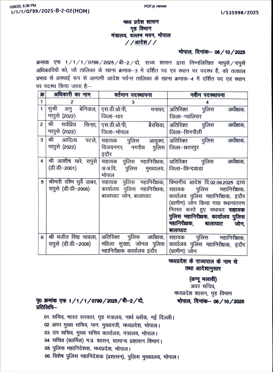 पुलिस विभाग में एक बार फिर बड़ा फेरबदल, ये 3 IPS अफसर बने एडिशनल एसपी, Major reshuffle in Madhya Pradesh Police Department, transfer list of 6 officers released