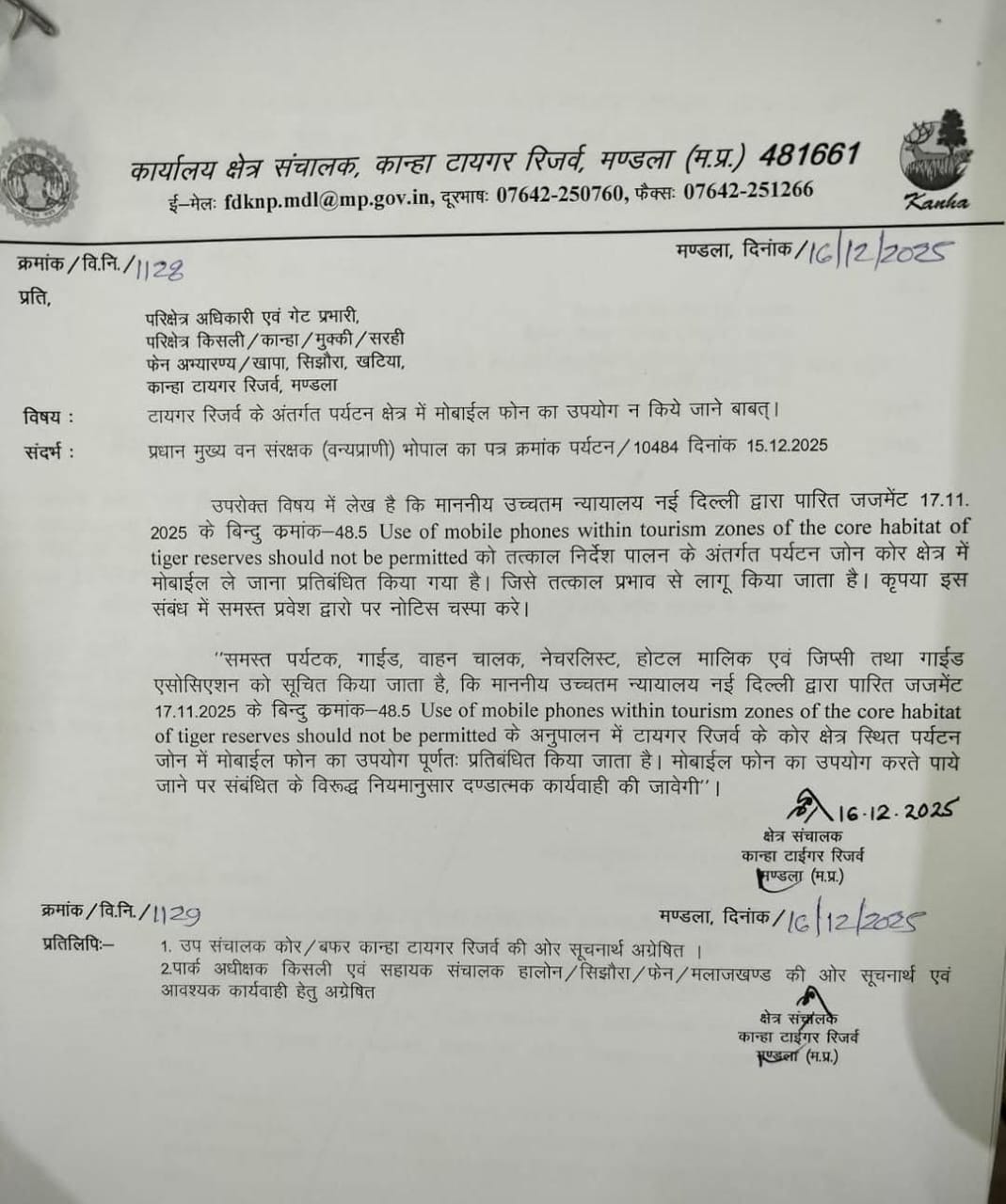 वन विभाग मुख्यालय के निर्देश के बाद अब मंडला जिले में स्थित कान्हा टाइगर रिजर्व प्रबंधन ने भी आदेश जारी किया है। इसमें कहा गया है कि सुप्रीम कोर्ट के फैसले के आधार पर टाइगर रिजर्व के कोर हैबिटेट एरिया में मोबाइल फोन प्रतिबंधित किया गया है। इसे तत्काल प्रभाव से लागू किया जाता है।