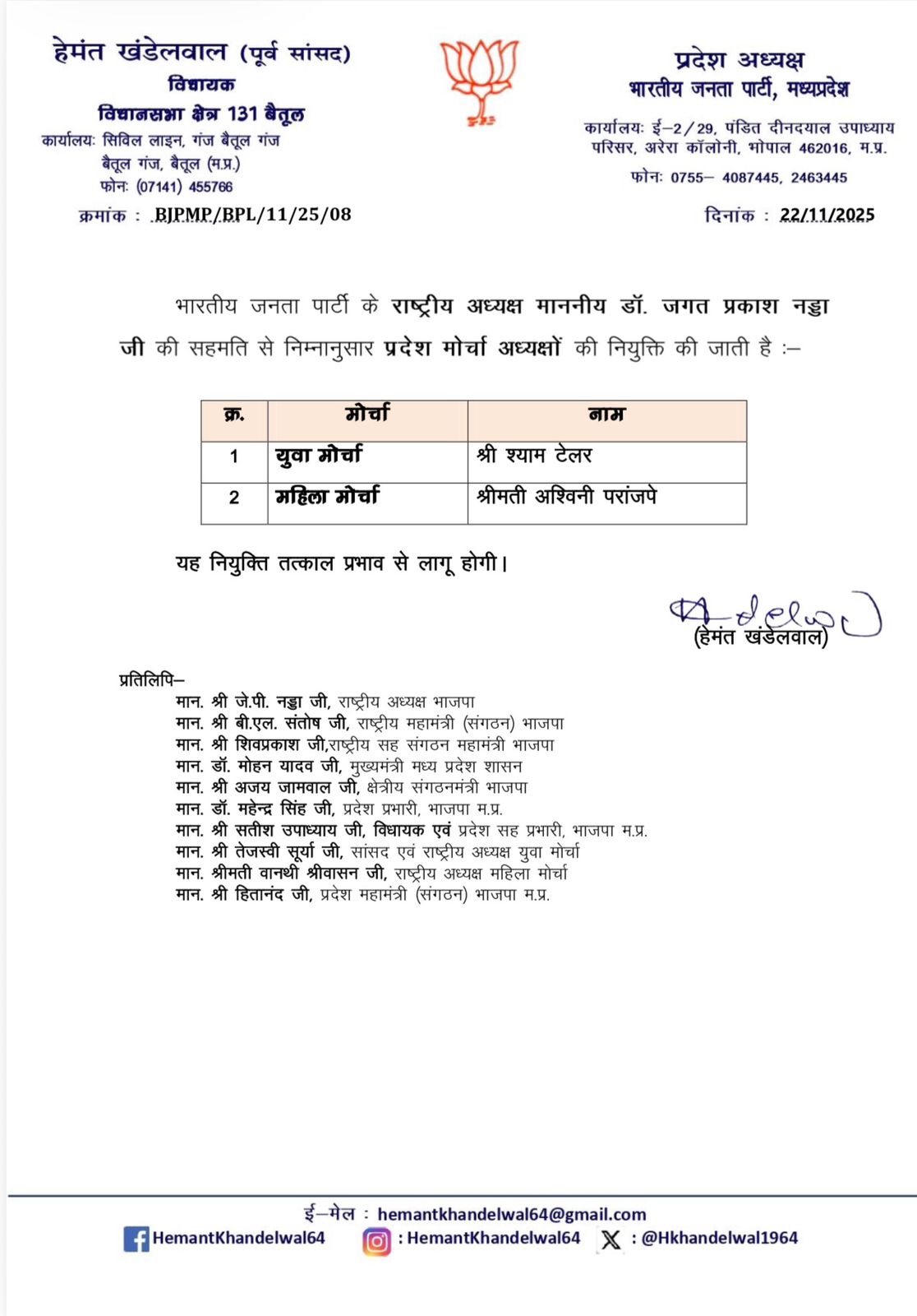 भोपाल। MP BJP Latest News मध्यप्रदेश भारतीय जनता पार्टी ने शनिवार को अपने संगठनात्मक ढांचे में बड़ा बदलाव किया है। प्रदेश अध्यक्ष हेमंत खंडेलवाल ने पार्टी ने युवा मोर्चा और महिला मोर्चा के नए प्रदेश अध्यक्षों के नाम का ऐलान किया है। श्याम टेलर को बीजेपी युवा मोर्चा का प्रदेश अध्यक्ष बनाया गया है। वहीं अश्वनी परांजपे को महिला मोर्चा की प्रदेश अध्यक्ष की जिम्मेदारी सौंपी गई है। इस संबंध में पार्टी ने आदेश भी जारी कर दिया है।