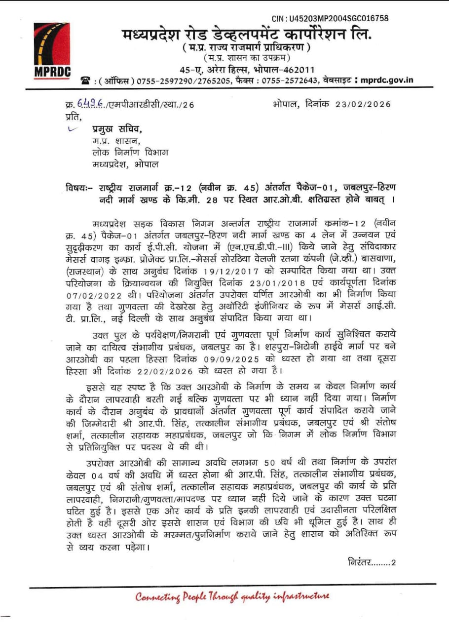 भोपाल। MP Bridge Collapse: मध्यप्रदेश के जबलपुर में रेलवे क्रॉसिंग के ऊपर बने ओवरब्रिज का एक हिस्सा धंसने के मामले में अब जिम्मेदार अधिकारियों पर कार्रवाई की तैयारी शुरू हो गई है। इस प्रकरण में मध्यप्रदेश रोड डेवलपमेंट कॉर्पोरेशन (MPRDC) ने तत्कालीन संभागीय प्रबंधक आरपी सिंह और तत्कालीन सहायक महाप्रबंधक संतोष शर्मा की पेंशन रोकने की सिफारिश की है।