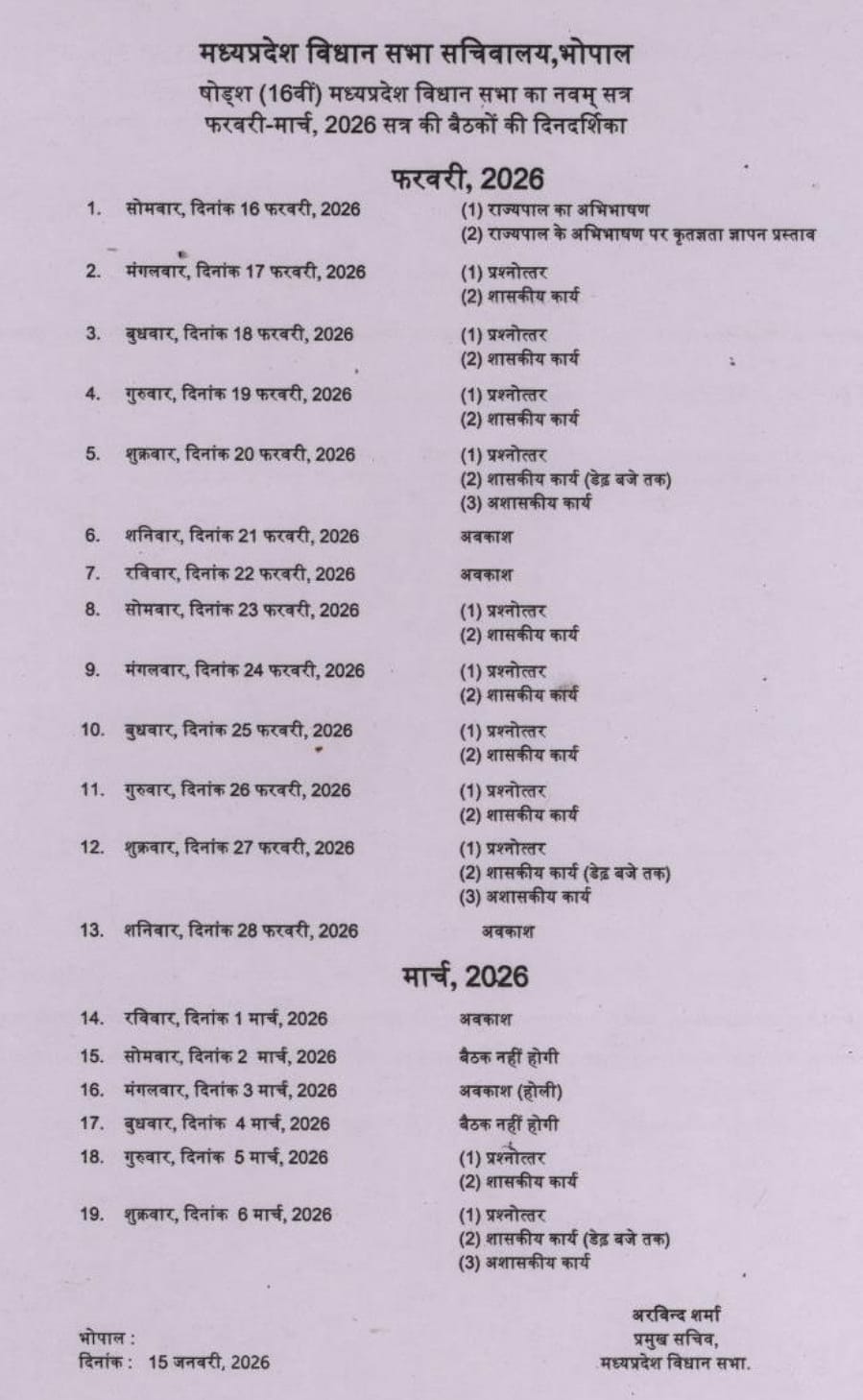 भोपाल। MP Budget Session 2026: मध्य प्रदेश विधानसभा के बजट सत्र के लिए अधिसूचना जारी कर दी गई है। इस बार का बजट सत्र 16 फरवरी से शुरू होकर 6 मार्च तक चलेगा। यह सत्र कुल 19 दिनों का होगा, जिसमें 12 बैठकें आयोजित की जाएंगी। बजट सत्र के दौरान राज्य सरकार वित्तीय वर्ष 2026-27 का बजट पेश करेगी। इसके साथ ही विभिन्न विभागों से जुड़े सवाल, ध्यानाकर्षण प्रस्ताव, शासकीय विधेयक और अन्य महत्वपूर्ण विषयों पर चर्चा की जाएगी। हालांकि अभी पेश करने की तारीख सामने नहीं आई है। कहा जा रहा है सरकार जल्द ही इसका ऐलान कर सकती है।