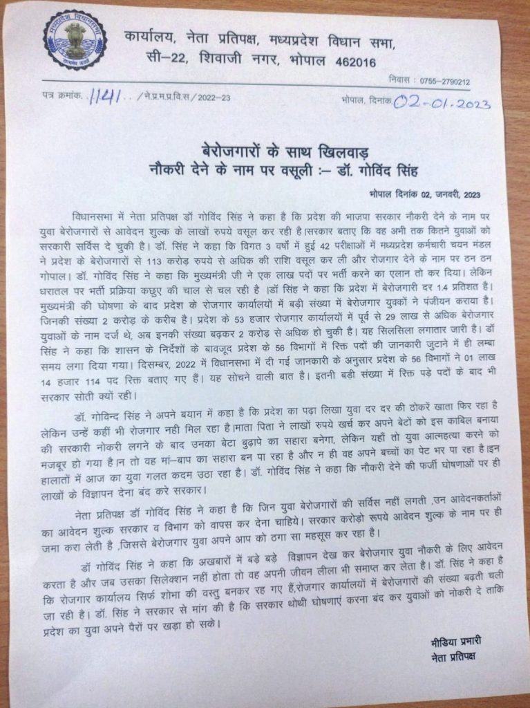 Government figures exposed unemployment: विधानसभा में नेता प्रतिपक्ष डॉ गोविंद सिंह ने कहा है कि प्रदेश की भाजपा सरकार नौकरी देने के नाम पर युवा बेरोजगारों से आवेदन शुल्क के लाखों रुपये वसूल कर रही है। सरकार बताए कि वह अभी तक कितने युवाओं को सरकारी सर्विस दे चुकी है। डॉ. सिंह ने कहा कि विगत 3 वर्षों में हुई 42 परीक्षाओं में मध्यप्रदेश कर्मचारी चयन मंडल ने प्रदेश के बेरोजगारों से 113 करोड़ रुपये से अधिक की राशि वसूल कर ली और रोजगार देने के नाम पर ठन-ठन गोपाल। डॉ. गोविंद सिंह ने कहा कि मुख्यमंत्री ने एक लाख पदों पर भर्ती करने का एलान तो कर दिया। लेकिन धरातल पर भर्ती प्रक्रिया कछुए की चाल से चल रही है ।