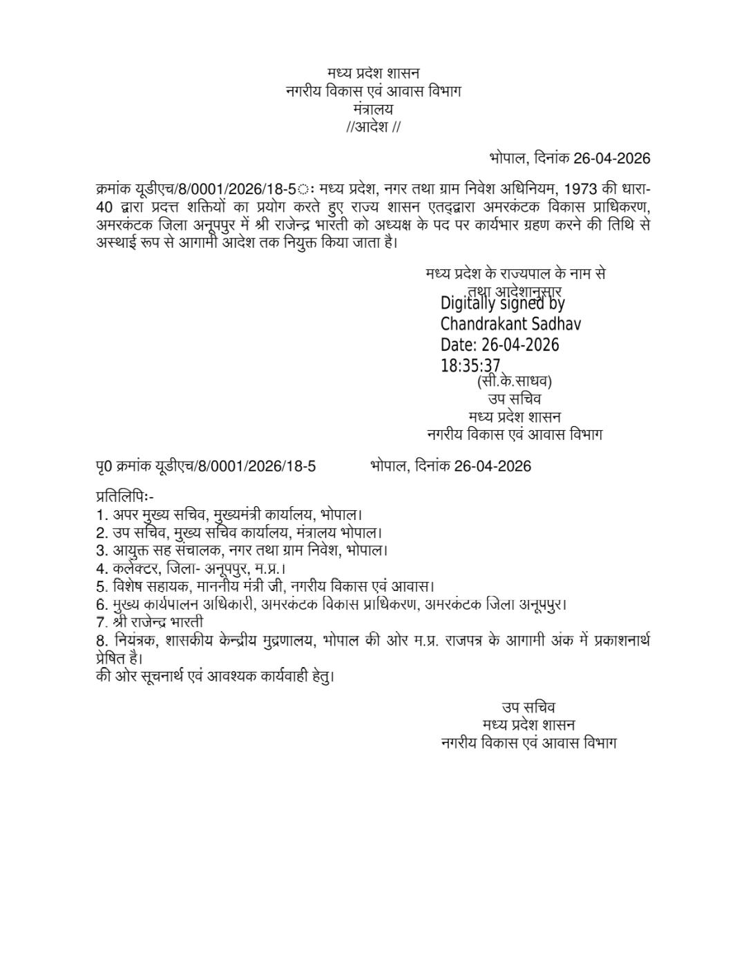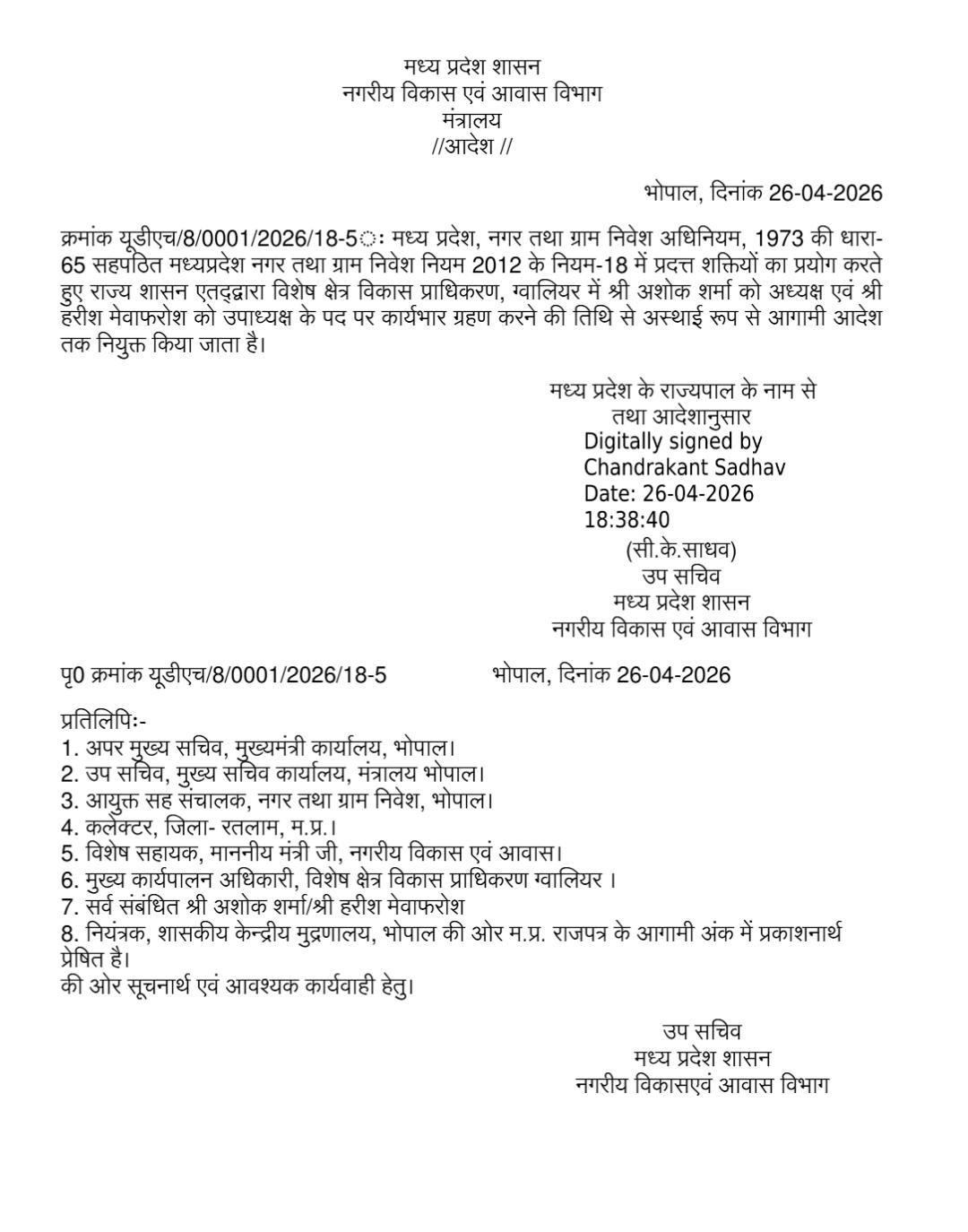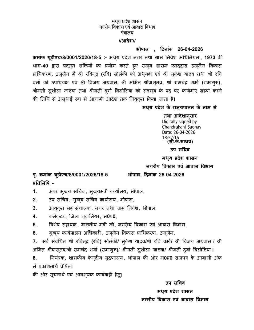 इसी तरह उज्जैन विकास प्राधिकरण (यूडीए) के अध्यक्ष पद पर रविंद्र सोलंकी को नियुक्त किया गया है। मुकेश यादव और रवि वर्मा को उपाध्यक्ष बनाया गया है, जबकि पांच अन्य सदस्यों की भी नियुक्ति की गई है। अमरकंटक विकास प्राधिकरण के अध्यक्ष पद पर राजेंद्र भारती को जिम्मेदारी सौंपी गई है। इसके अलावा ग्वालियर विशेष क्षेत्र विकास प्राधिकरण (SADA) के अध्यक्ष के रूप में अशोक शर्मा को नियुक्त किया गया है, जबकि हरीश मेवाफरोश को उपाध्यक्ष बनाया गया है। वहीं सहकारिता विभाग के तहत अपेक्स बैंक के अध्यक्ष पद पर महेंद्र सिंह यादव की नियुक्ति की गई है।