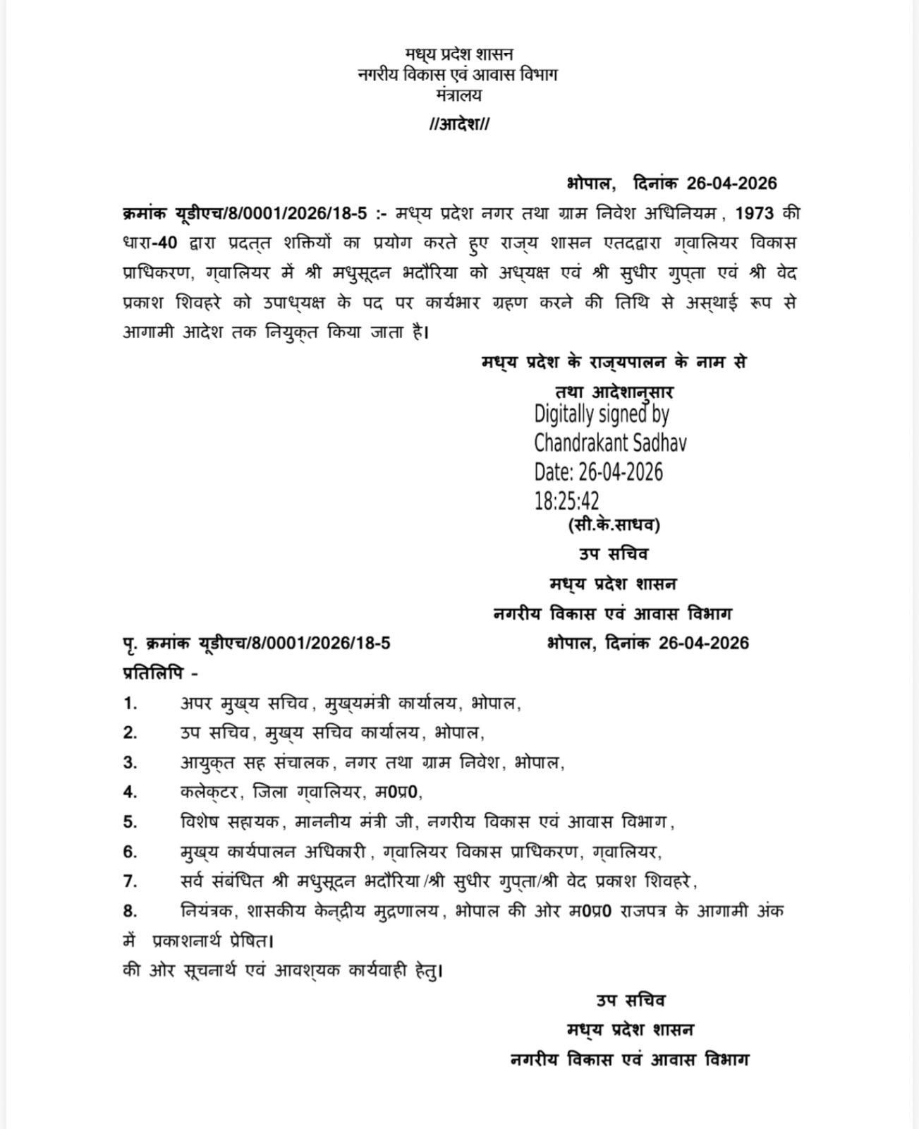 भोपालः मध्यप्रदेश में विभिन्न विकास प्राधिकरणों के साथ-साथ निगम मंडलों में नियुक्तियों का सिलसिला जारी है। ग्वालियर विकास प्राधिकरण के अध्यक्ष पद पर मधुसूदन सिंह भदौरिया की नियुक्ति की गई है। वहीं, सुधीर गुप्ता और वेद प्रकाश शिवहरे को उपाध्यक्ष बनाया गया है। भदौरिया संघ पृष्ठभूमि से जुड़े हैं, जबकि सुधीर गुप्ता सिंधिया खेमे से और वेद प्रकाश शिवहरे विधानसभा अध्यक्ष नरेंद्र सिंह तोमर के खेमे के नेता माने जाते हैं।