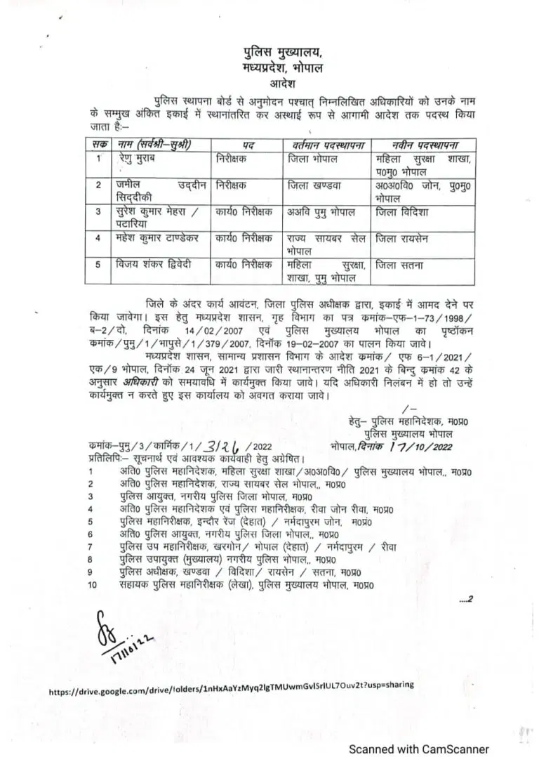 MP Police Transfer : भोपाल – मध्यप्रदेश में इन दिनों सभी विभागों में तबादलों का सिलसिला चलता जा रहा है। वहीं एक बार फिर मप्र में जारी तबादलों के क्रम में राज्य शासन ने पुलिस इंस्पेक्टर्स के तबादलों की लिस्ट जारी की है। पुलिस मुख्यालय ने जारी दो अलग अलग तबादला आदेश में 7 इंस्पेक्टर्स को इधर से उधर किया है। यहाँ हम दोनों लिस्ट दे रहे हैं जिसमें इन पुलिस अधिकारियों के नाम और नई पदस्थापना की जगह देखी जा सकती है।>>*IBC24 News Channel के WHATSAPP ग्रुप से जुड़ने के लिए यहां CLICK करें*<<