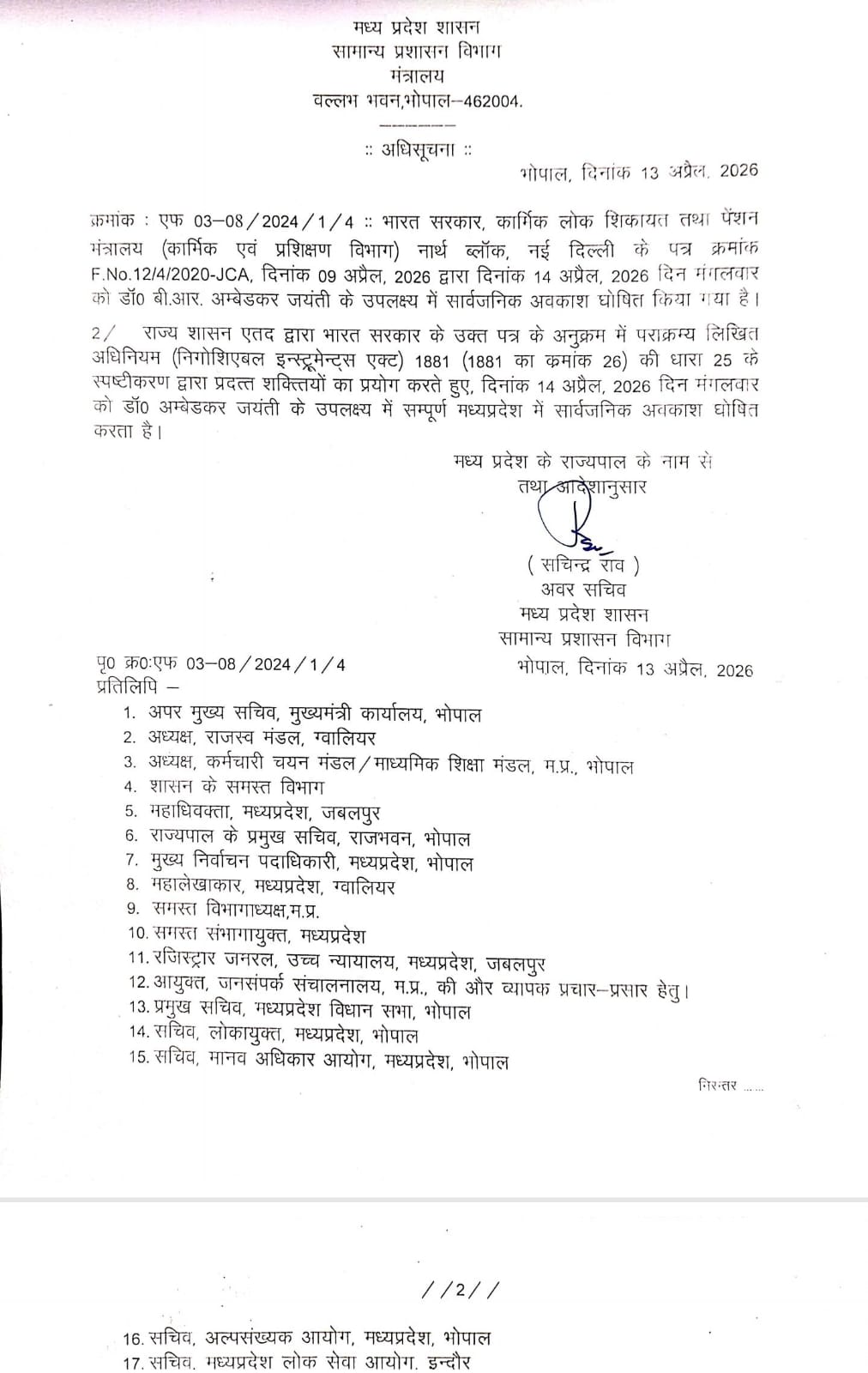 भोपाल। Public Holiday Latest News अंबेडकर जयंती के अवसर पर 14 अप्रैल को प्रदेश में सार्वजनिक अवकाश रहेगा। सामान्य प्रशासन विभाग ने इस संबंध में आदेश जारी कर दिया है। जारी आदेश के अनुसार 14 अप्रैल को शासकीय कार्यालयों, स्कूलों और अन्य सरकारी संस्थानों में अवकाश रहेगा। यह अवकाश डॉ. भीमराव अंबेडकर की जयंती के उपलक्ष्य में घोषित किया गया है। सामान्य प्रशासन विभाग ने सभी विभागों और संबंधित अधिकारियों को आदेश का पालन सुनिश्चित करने के निर्देश दिए हैं। इस दिन सरकारी कार्य बंद रहेंगे, जबकि आवश्यक सेवाएं पूर्व की तरह संचालित होती रहेंगी।