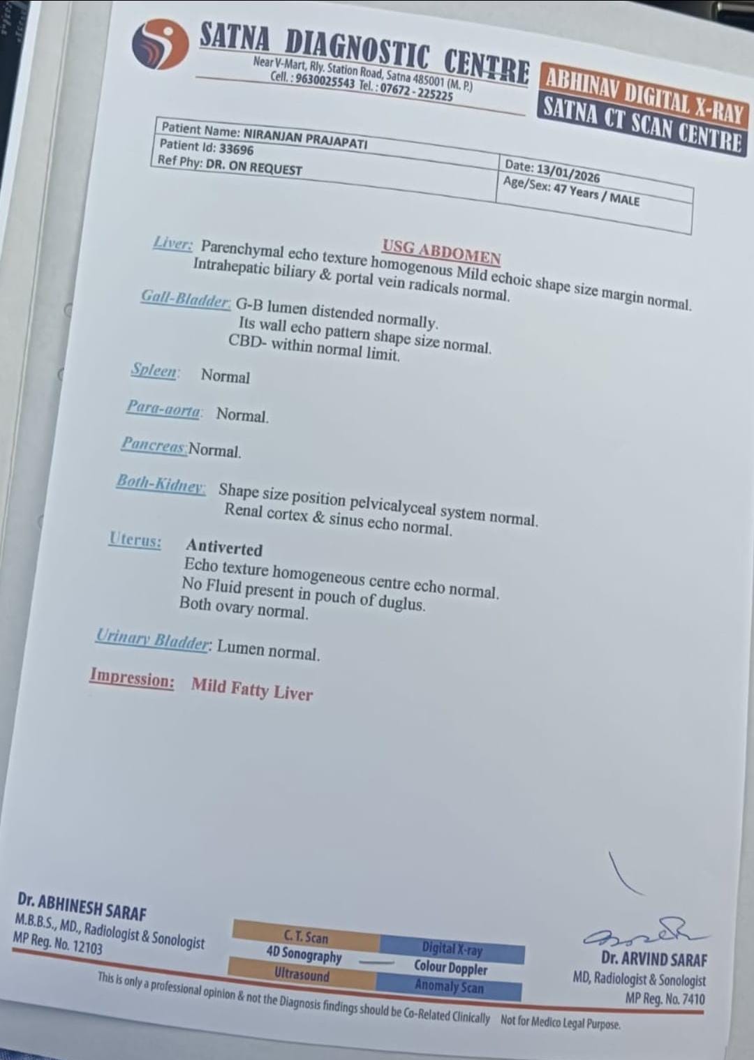 सतनाः Uterus in Male Abdomen: मध्यप्रदेश के सतना शहर के स्टेशन रोड स्थित सतना डायग्नोस्टिक सेंटर की एक सोनोग्राफी रिपोर्ट ने सबको चौंका दिया है। रिपोर्ट में 47 वर्षीय एक पुरुष मरीज में यूट्रस (गर्भाशय) बताया गया है। यह जांच रिपोर्ट जिले के एक जिम्मेदार जनप्रतिनिधि की बताई जा रही है। दरअसल, उचेहरा नगर पंचायत के अध्यक्ष और भाजपा नेता निरंजन प्रजापति को पेट में तकलीफ होने पर 13 जनवरी को सतना डायग्नोस्टिक सेंटर में सोनोग्राफी कराई गई थी। रिपोर्ट में न केवल गर्भाशय बताया गया है, बल्कि उसे उल्टा भी दर्शाया गया है। इस गंभीर लापरवाही को लेकर जब सतना डायग्नोस्टिक सेंटर के संचालक डॉ. अरविंद सराफ से जानकारी चाही गई तो उन्होंने कुछ भी कहने से इनकार कर दिया।