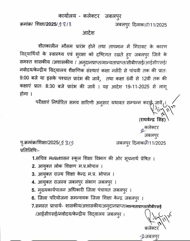 जबलपुर: School Time Changed, जबलपुर में तापमान की गिरावट के बाद बढ़ती हुई ठंड के मद्देनजर अब स्कूलों और आंगनबाड़ी के समय में बदलाव किया गया है। जबलपुर कलेक्टर राघवेंद्र सिंह ने सभी स्कूलों के समय में बदलाव किया है जिसमें नर्सरी से पांचवीं तक की कक्षाएं सुबह 9 बजे के बाद लगेंगी। वहीं 6वीं से 12वीं तक की कक्षाएं 8:30 के बाद लगाने का आदेश जारी किया गया है।