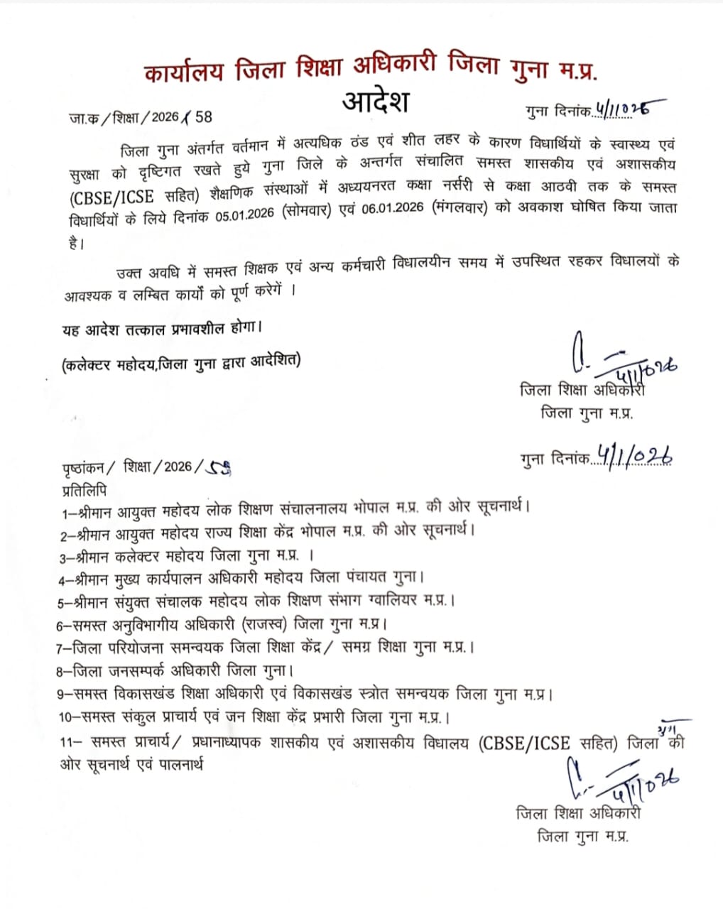 School Closed in Guna जिला प्रशासन ने जारी किया आदेश