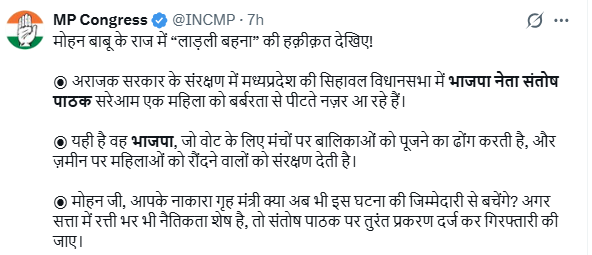 सीधी: BJP Leader Viral video मध्य प्रदेश के सीधी जिले से भाजपा नेता की गुंडागर्दी का मामला सामने आया है। बहरी थाना क्षेत्र के बस स्टैंड पर, पुलिस थाने से महज 100 मीटर की दूरी पर भाजपा नेता संतोष पाठक ने एक महिला दुकानदार के साथ जमकर मारपीट की। इस पूरी घटना का वीडियो सोशल मीडिया पर तेज़ी से वायरल हो रहा है। इस पूरे मामले में पुलिस ने मामला दर्ज कर लिया है, लेकिन आरोपी की गिरफ्तारी अभी तक नहीं हो पाई है। इस मामले में कांग्रेस ने जमकर भाजपा सरकार पर निशाना साधा है।