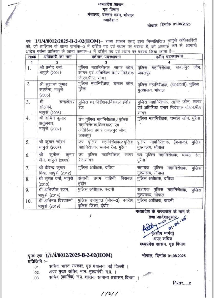 भोपालः MP IPS Transfer: कटनी एसपी अभिजीत रंजन, दतिया के एसपी वीरेंद्र कुमार, चंबल रेंज के आईजी सुशांत कुमार सक्सेना और डीआईजी को हटा दिया गया है। खुद सीएम डॉ. मोहन यादव ने सोशल मीडिया पर इन अधिकारियों को हटाए जाने की जानकारी दी है। अब यहां नए अधिकारियों की पोस्टिंग कर दी गई है। पुलिस विभाग की ओर से जारी आदेश के मुताबिक सचिन अतुलकर को अब चंबल रेंज का नया आईजी बनाया गया है। वहीं सुनील कुमार जैन को डीआईजी बनाया गया है। इसके अलावा IPS अभिनव विश्वकर्मा कटनी के नए पुलिस अधीक्षक होंगे। वहीं सूरज वर्मा को अब दतिया जिले की कमान सौंपी गई है। इसके अलावा कई और अन्य अधिकारियों के प्रभार में बदलाव किया गया है।