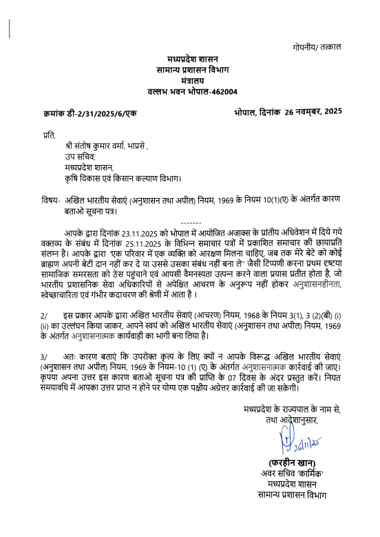 - ब्राह्मण समाज पर विवादित टिप्पणी को लेकर आईएएस संतोष वर्मा को कारण बताओ नोटिस जारी।