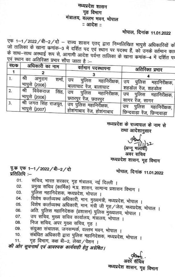 इसके अलावा होशंगाबाद रेंज के उप पुलिस महानिरीक्षक जगत सिंह राजपूत को अब छिंदवाड़ा की जिम्मेदारी सौंपी गई है।