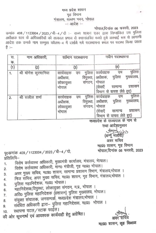 Today DSP officers transferred in Madhya Pradesh : आदेश के अनुसार कार्यवाहक डीएसपी योगेश कुरचानिया और कार्यवाहक डीएसपी सलील शर्मा को विशेष पुलिस स्थापना लोकायुक्त संगठन भोपाल से ट्रांसफर कर पुलिस मुख्यालय भोपाल पदस्थ किया गया है। गृह विभाग ने सामान्य प्रशासन विभाग से इनकी सेवाएं वापस ले ली हैं।