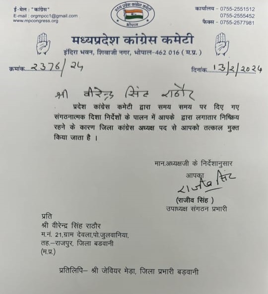 Congress leader join BJP in mp: भोपाल। कांग्रेस ने बड़वानी कांग्रेस जिला अध्यक्ष को हटा दिया है। प्रदेश अध्यक्ष जीतू पटवारी के निर्देश पर बड़वानी जिला अध्यक्ष हटाये गए हैं। संगठन के कार्यों में लापरवाही एवं निष्क्रियता के कारण उन्हे तत्काल प्रभाव से पदमुक्त किया गया है।