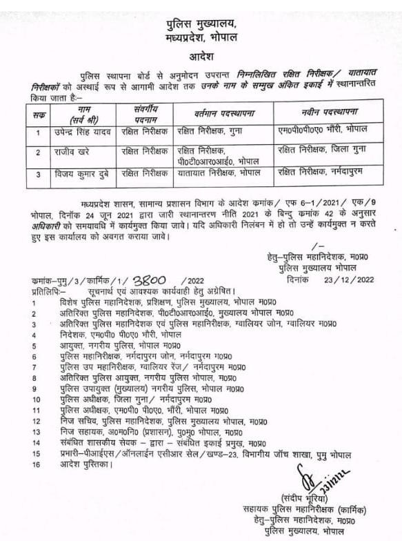 Transfer of officers in MP Police Department : PHQ द्वारा जारी की गई सूची में तीन रक्षित निरीक्षकों को तबादला कर नई जगह भेजा गया है, इसमें रक्षित निरीक्षक गुना उपेन्द्र सिंह यादव को एमपीपीए भौरी भोपाल, रक्षित निरीक्षक पीटीआरआई भोपाल राजीव खरे को रक्षित निरीक्षक गुना और यातायात निरीक्षक (रक्षित निरीक्षक) भोपाल विजय कुमार दुबे को रक्षित निरीक्षक नर्मदापुरम भेजा गया है।