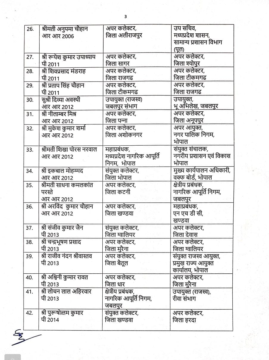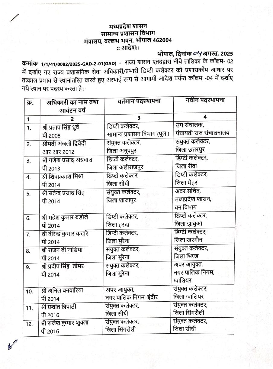 MP Transfer News: जारी आदेश के अनुसार जिन अधिकारियों का तबादला किया गया है, उनमें अपर कलेक्टरों, संयुक्त कलेक्टरों और डिप्टी कलेक्टरों का नाम शामिल है। इसके अलावा सिंगरौली नगर निगम कमिश्नर को हटाया गया है।