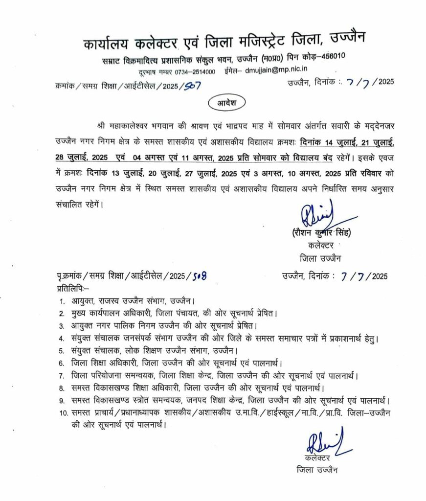 आदेश में कहा गया है, "श्रावण के दौरान भगवान महाकालेश्वर की सवारी के मद्देनजर, उज्जैन नगर निगम क्षेत्र की सीमा के भीतर सभी सरकारी और गैर-सरकारी स्कूल 14 जुलाई, 21 जुलाई, 28 जुलाई, 4 अगस्त और 11 अगस्त को प्रत्येक सोमवार को बंद रहेंगे।