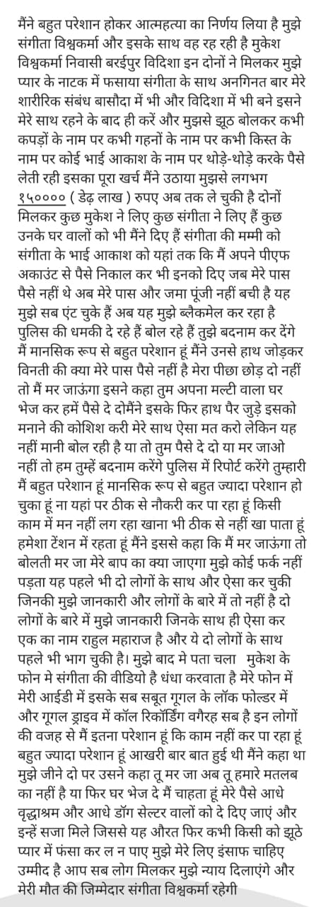 मृतक ने अपने नोट में बताया कि विदिशा के बरईपुरा क्षेत्र में रहने वाली महिला संगीता विश्वकर्मा और उसके पति मुकेश विश्वकर्मा ने उसे प्रेम जाल में फंसाया। इसके बाद दोनों ने लगातार उससे पैसे ऐंठे। अब तक वे उससे करीब डेढ़ से दो लाख रुपए ले चुके थे। जब किराज के पास पैसे नहीं बचे, तो वह मानसिक रूप से परेशान हो गया और आत्महत्या करने का फैसला किया। मृतक ने फेसबुक और इंस्टाग्राम स्टोरी पर अपनी दुखद घटना साझा की और आरोपियों के खिलाफ सख्त कार्रवाई की मांग की ताकि भविष्य में किसी और के साथ ऐसा न हो।