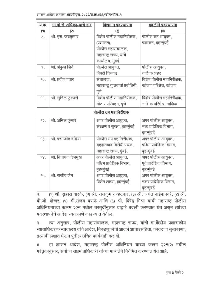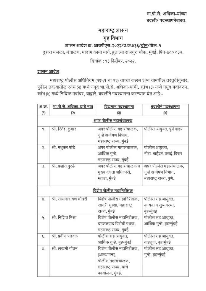 Transfer of 30 IPS officers in Maharashtra : 30 आईपीएस अधिकारियों को नवीन पदस्थापना सौंपते हुए कुछ को प्रमोशन का भी लाभ दिया गया।