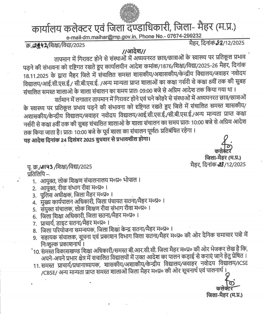 मैहर: School Timing Change Latest Order: मध्यप्रदेश के मैहर जिले में कड़ाके की ठंड और घने कोहरे के चलते प्रशासन ने बच्चों की सुरक्षा और स्वास्थ्य को ध्यान में रखते हुए स्कूलों के समय में बड़ा बदलाव किया है। जिले के कलेक्टर रानी बाटड़ ने आदेश जारी किया है।