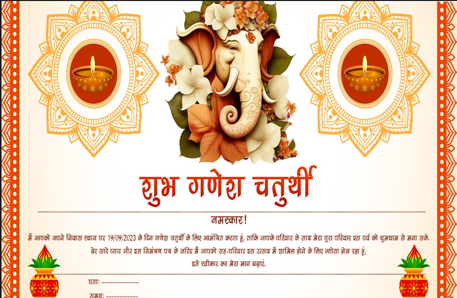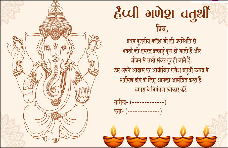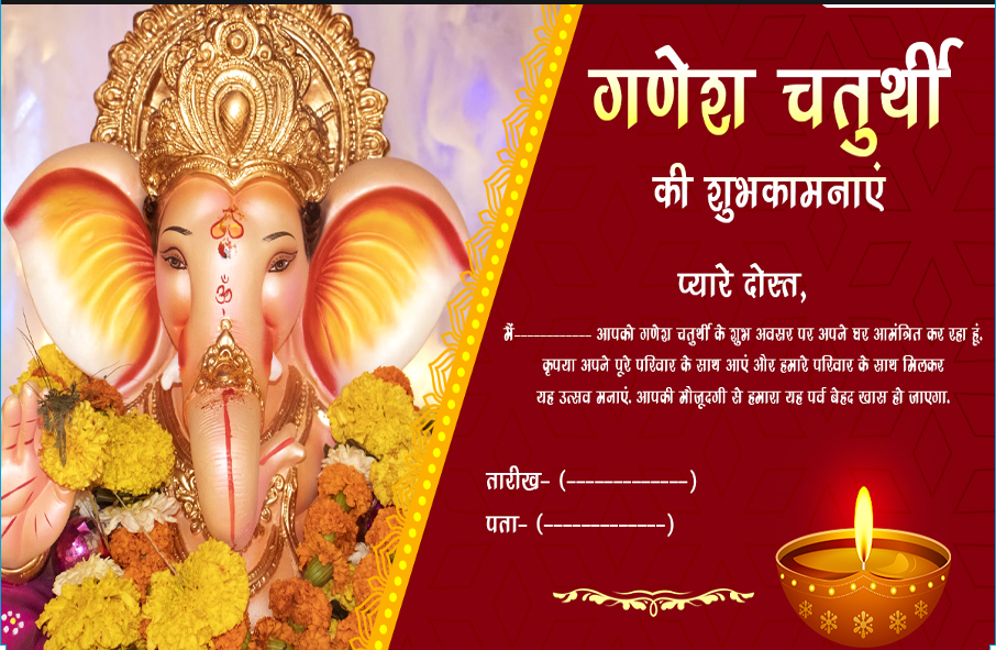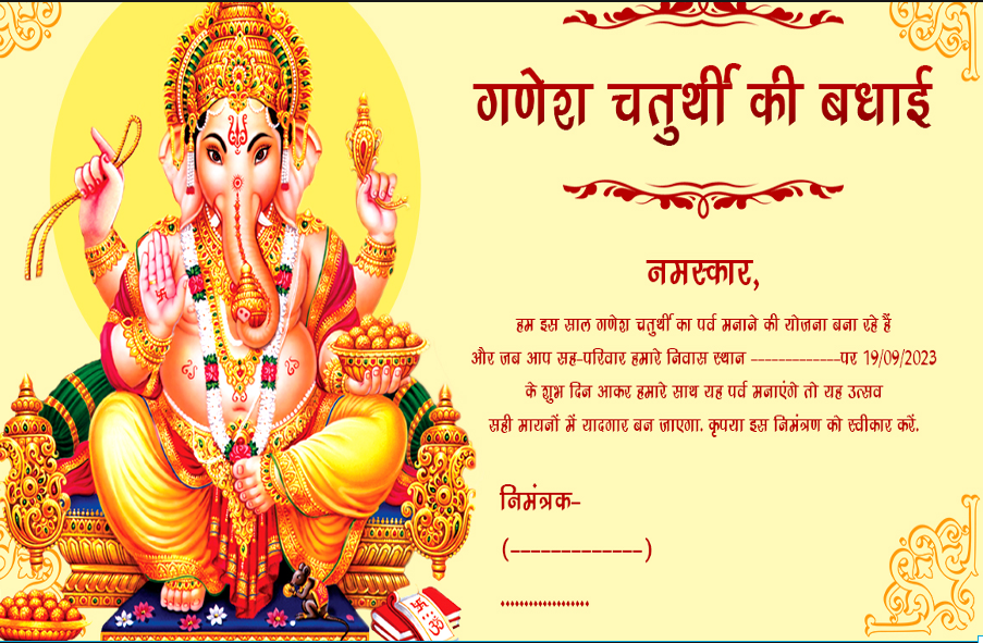 - शुभ गणेश चतुर्थीनमस्कार!मैं आपको अपने निवास स्थान पर 19/09/2023 के दिन गणेश चतुर्थी के लिए आमंत्रित करता हूं, ताकि आपके परिवार के साथ मेरा पूरा परिवार इस पर्व को धूमधाम से मना सके. ढेर सारे प्यार और इस निमंत्रण पत्र के जरिए मैं आपको सह-परिवार इस उत्सव में शामिल होने के लिए न्योता भेज रहा हूं, इसे स्वीकार कर मेरा मान बढ़ाएं.पता: ————–समय: ————