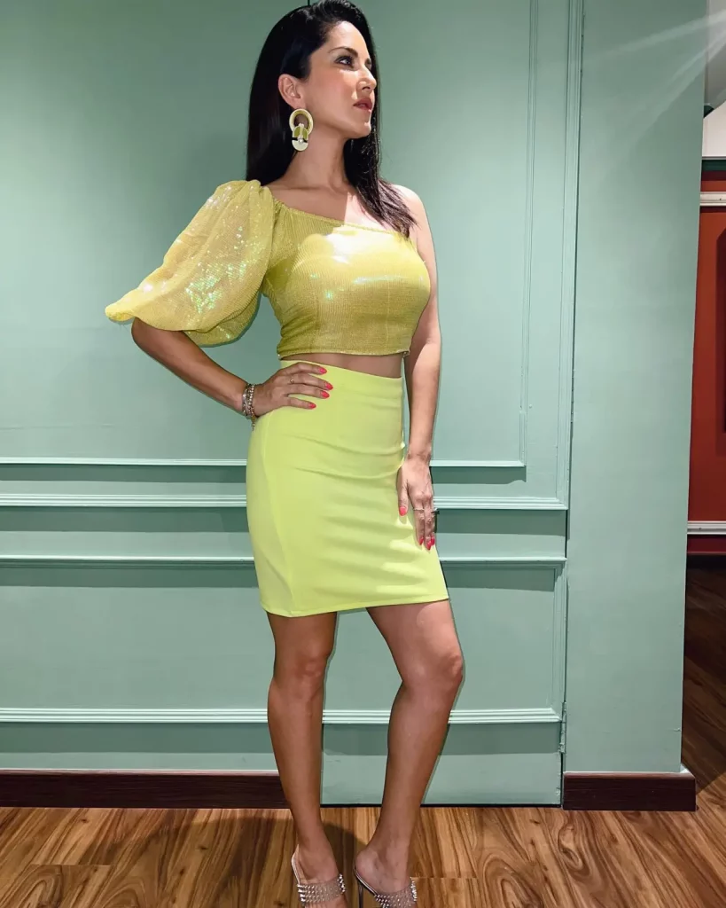 लेटेस्ट फोटोज में सनी को नियॉन कलर का वन शोल्डर शॉर्ट टॉप और मिनी स्कर्ट पहने हुए देखा जा सकता है। अपने लुक को पूरा करने के लिए अदाकारा ने न्यूड मेकअप किया और बालों को स्ट्रेट स्टाइल में ओपन रखा है।