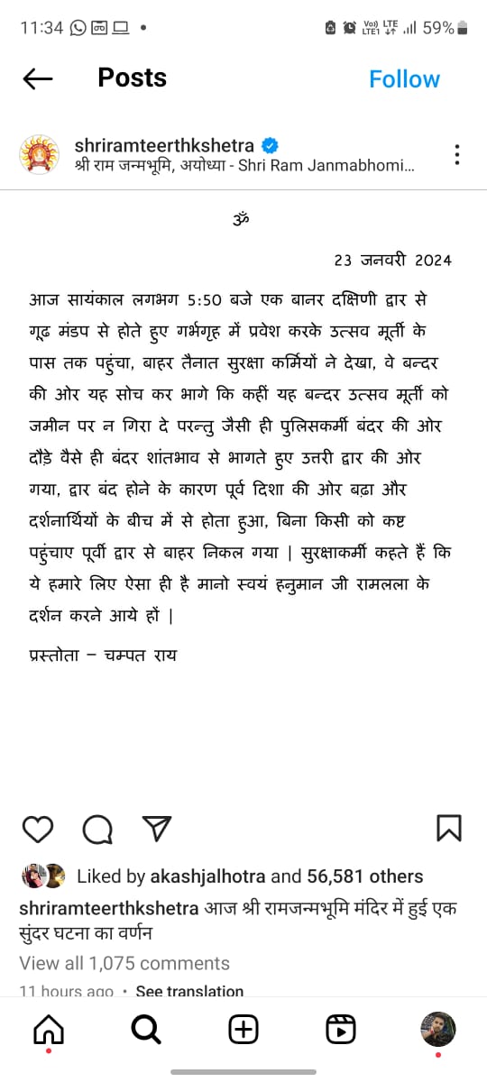 दरअसल, राम मंदिर में रामलला की मूर्ति की प्राण प्रतिष्ठा के बाद 23 जनवरी को शाम 5.30 बजे एक वानर कहीं से आया और मंदिर में घुस गया। इस दौरान सुरक्षा कर्मियों ने तमाम तरीके से वानर को रोकने का प्रयास किया लेकिन बंदर ने अंतत भगवान राम की मूर्ति के पास तक पहुंचने में कामयाब रहा। इस बात की जानकारी राम मंदिर क्षेत्र ट्रस्ट के महासचिव संपत राय ने इंस्टाग्राम के जरिए दी है। इस आशय का उन्होंने एक नोट भी इंस्टाग्राम में शेयर किया है। जिसमें कहा गया है कि ऐसा प्रतीत हो रहा है, जैसा कि स्वयं हनुमान जी ही वानर के रूप में भगवान राम के दर्शन करने के लिए पहुंचे थे।