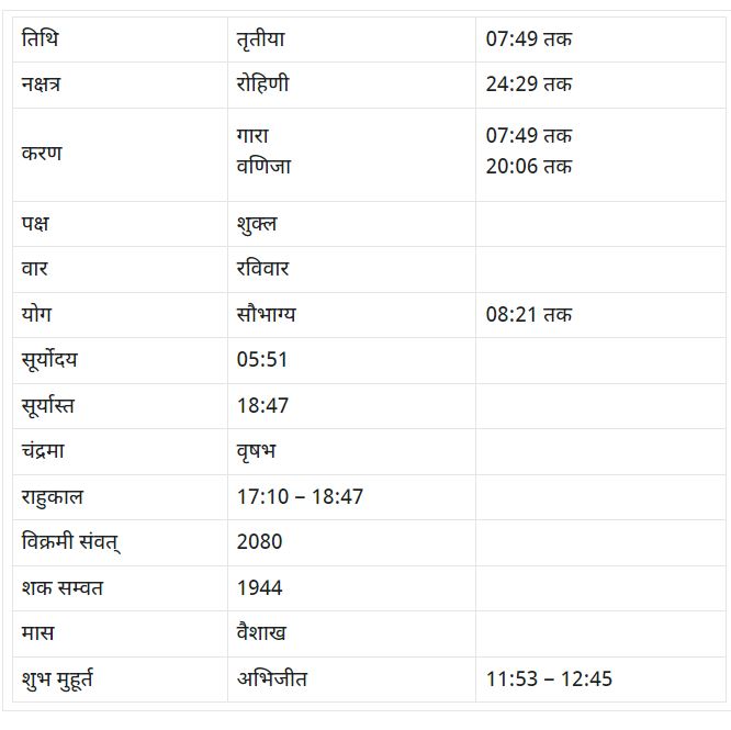 23 अप्रैल 2023 का दैनिक पंचांग / Aaj Ka Panchang: हिंदू पंचांग को वैदिक पंचांग के नाम से जाना जाता है। पंचांग के माध्यम से समय एवं काल की सटीक गणना की जाती है। पंचांग मुख्य रूप से पांच अंगों से मिलकर बना होता है। ये पांच अंग तिथि, नक्षत्र, वार, योग और करण है। यहां हम दैनिक पंचांग में आपको शुभ मुहूर्त, राहुकाल, सूर्योदय और सूर्यास्त का समय, तिथि, करण, नक्षत्र, सूर्य और चंद्र ग्रह की स्थिति, हिंदूमास एवं पक्ष आदि की जानकारी देते हैं। आइए जानते हैं आज का शुभ मुहूर्त और राहुकाल का समय।