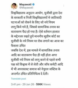 हमारा देश इसीलिए महान है क्योंकि यहां भिन्न-भिन्न विचारधाराएं हैं। लेकिन जब बात राष्ट्रीय एकता और सामाजिक समरसता की आती है तो समूचा समाज एकजुट होता है। उत्तर प्रदेश की पूर्व मुख्यमंत्री और बहुजन समाज पार्टी की राष्ट्रीय अध्यक्ष बहन कुमारी मायावती का ये संदेश देखिए — “विश्वविद्यालय अनुदान आयोग, यूजीसी द्वारा देश के सरकारी व निजी विश्वविद्यालयों मे जातिवादी घटनाओं को रोकने के लिए जो नये नियम लागू किये गये है, जिससे सामाजिक तनाव का वातावरण पैदा हो गया है। ऐसे वर्तमान हालात के मद्देनजर रखते हुये माननीय सुप्रीम कोर्ट का यूजीसी के नये नियम पर रोक लगाने का आज का फैसला उचित। जबकि देश में, इस मामले में सामाजिक तनाव आदि का वातावरण पैदा ही नहीं होता। अगर यूजीसी नये नियम को लागू करने से पहले सभी पक्ष को विश्वास में ले लेती और जांच कमेटी आदि में भी अपरकास्ट समाज को नेचुरल जस्टिस के अन्तर्गत उचित प्रतिनिधित्व दे देती।”