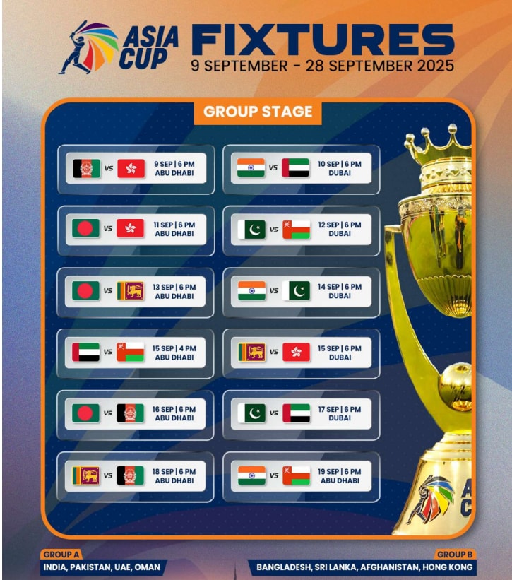 Asia Cup 2025: यह टूर्नामेंट 9 से 28 सितंबर तक खेला जाएगा। भारत का पहला ग्रुप ए मैच संयुक्त अरब अमीरात के खिलाफ 10 सितंबर को दुबई में होगा, और ग्रुप स्टेज का आखिरी मैच ओमान के खिलाफ 19 सितंबर को अबू धाबी में खेला जाएगा।