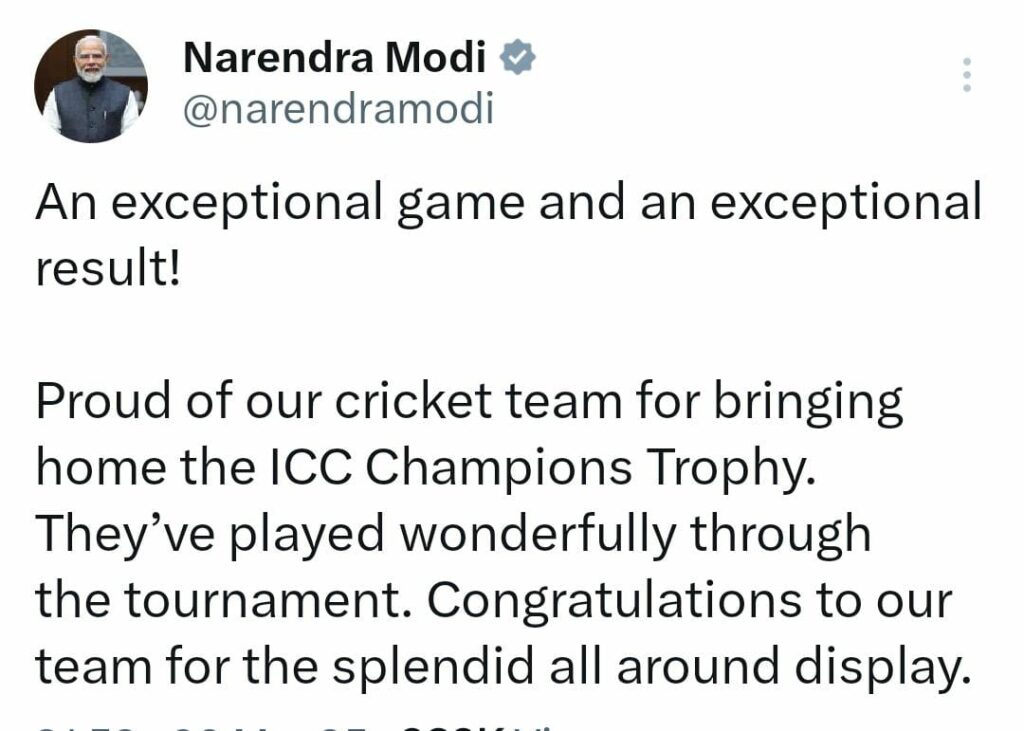 चैंपियंस ट्रॉफी में भारत की जीत पर पीएम मोदी ने एक्स पर ट्वीट कर कहा कि ‘एक असाधारण खेल और एक असाधारण परिणाम! ICC चैंपियंस ट्रॉफी घर लाने के लिए हमारी क्रिकेट टीम पर गर्व है। उन्होंने पूरे टूर्नामेंट में शानदार प्रदर्शन किया है। शानदार प्रदर्शन के लिए हमारी टीम को बधाई।