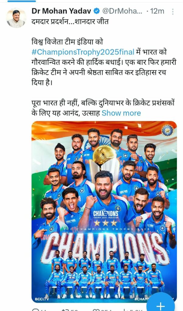 वहीं मध्यप्रदेश के सीएम डॉ मोहन यादव ने भी ट्वीट कर बधाई दी है। मुख्यमंत्री डॉ मोहन यादव ने टीम इंडिया को चैंपियंस ट्रॉफी में जीत पर बधाई दी है। सोशल मीडिया X पर मुख्यमंत्री ने बधाई देते हुए लिखा….दमदार प्रदर्शन…शानदार जीत विश्व विजेता टीम इंडिया को #ChampionsTrophy2025final में भारत को गौरवान्वित करने की हार्दिक बधाई.. एक बार फिर हमारी क्रिकेट टीम ने अपनी श्रेष्ठता साबित कर इतिहास रच दिया है… पूरा भारत ही नहीं, बल्कि दुनियाभर के क्रिकेट प्रशंसकों के लिए यह आनंद, उत्साह और उल्लास के क्षण हैं… भारतीय क्रिकेट टीम, कोच, प्रबंधन सहित सभी समर्पित साथियों को पुनः बधाई।